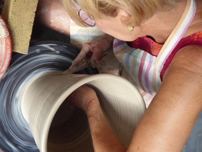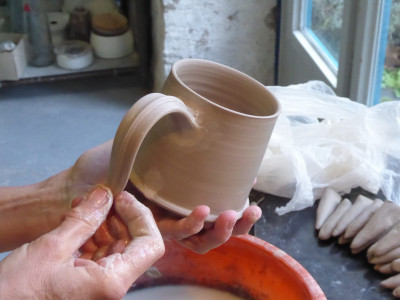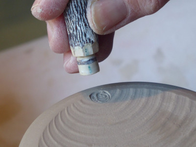 Aus rötlich brennendem Steinzeugton entstehen frei gedrehte und gebaute Gefäße in schlichten, ausgewogenen Formen, die auf die Wirkung des Kontrastes von glasierten und unglasierten Oberflächen, einfarbigen und farblich akzentuierten Flächen zielen und zum Be-greifen und Benutzen einladen. Teilbereiche der Gefäße werden noch im weichplastischen Zustand mit weißen und farbigen Porzellanfragmenten eingelegt und dann während des Trocknens mehrfach poliert. Die übrigen Gefäßoberflächen werden mit selbst entwickelten Feldspatglasuren überzogen oder sie erhalten im Brand Salzanflugglasuren. Ergänzend zu diesen eher steinartig-erdig wirkenden Stücken mit vergleichsweise dicker Wandstärke arbeite ich mit rein weißem Porzellan, das – sehr dünnwandig aufgebaut – federleichte , durchscheinende Gefäße ergibt, die in Kombination mit dem dunklen Steinzeug sehr gegensätzlich wirken. Stimmig wird das Ganze jedoch im Zusammenspiel mit den eingelegten Porzellanintarsien.